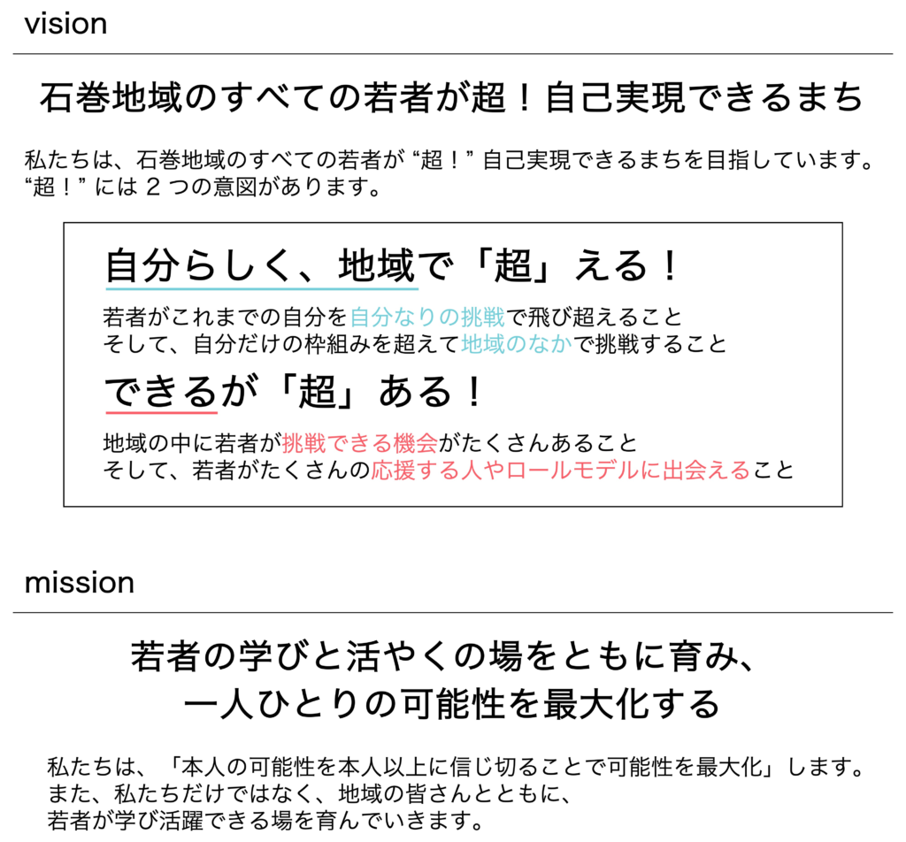 私たちは、「石巻地域のすべての若者が超!自己実現できるまちへ」をビジョンに掲げ、学校・行政・地域と連携しながら、高校生を中心とした若者の様々なチャレンジや成長をサポートする活動を行っています。